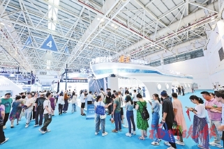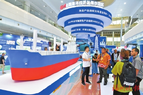 ?昨日,在福建省加快建设全国海洋经济发展示范区回顾与展望展区,国际友人参观全球最大8.5万吨级新型多用途船模型。记者叶诚摄