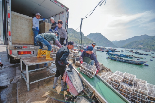 早年渔民需在渔排上手工称重,鲍鱼容易脱水。直到3年前,村里自筹资金建成全省首条渔排传送带,“海上电梯”改变了传统作业模式。“如今在采收旺季,高峰期每天过秤2万筐,总重超百吨。”码头负责人陈义忠说。