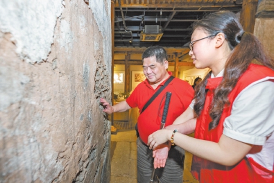 市国资委所属古厝集团举办“我是你的眼,将三坊七巷讲给你听”活动,视障人士在志愿者的帮助下触摸夯土墙。本报记者 林双伟摄