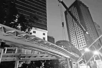 据了解,三港路节点栈桥一端衔接五四路百福桥,沿三港路、公正二路延伸,横跨观风亭街后,止于观风亭街西侧,全长约380米,总重400多吨,由21段钢梁、2处楼梯及1处电梯组成。