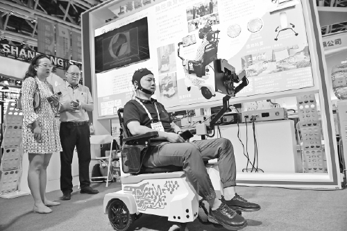 5月21日,在第九届丝绸之路国际博览会暨中国东西部合作与投资贸易洽谈会省际合作展上海市展区,工作人员演示脑控康复轮椅。
