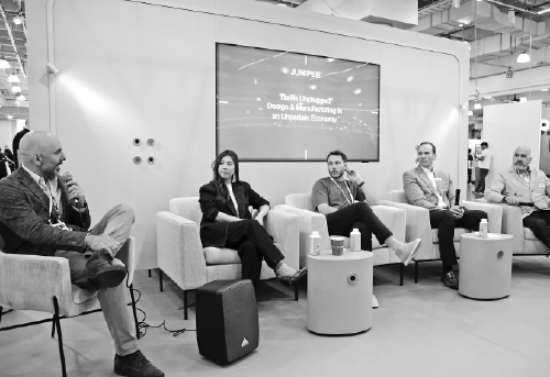 18日,嘉宾在美国纽约举行的2025年国际当代家具展上就关税进行小组讨论。新华社记者 刘亚南摄