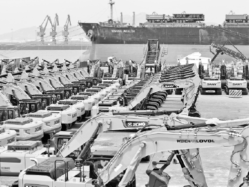 5月14日,国产挖掘机在山东港口烟台港集结等待装船出口。新华社发