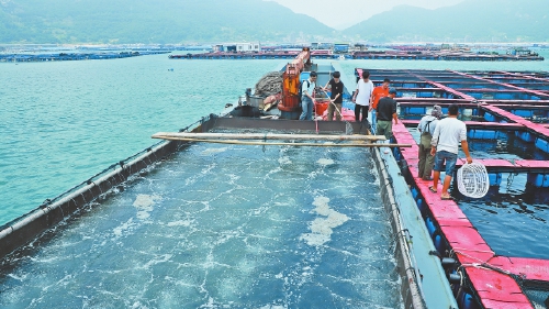 研究人员和渔民合力将绿鳍马面鲀投放到养殖网箱中。(连融媒供图)