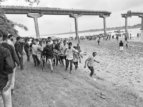 9日,救援人员在印度西部古吉拉特邦垮塌的桥梁旁开展救援行动。新华社发