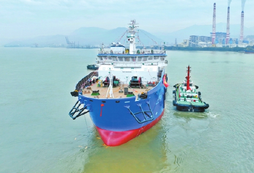 全电力驱动海上风电多功能运维母船在福州下水。新华社发
