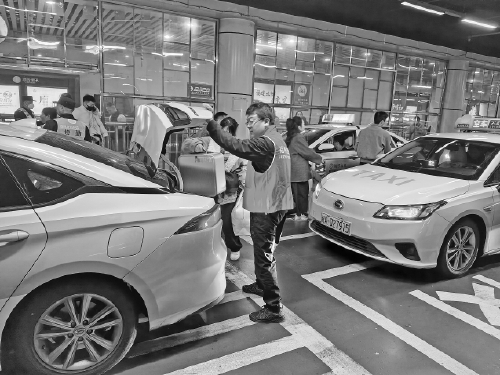 志愿者在福州火车站出租车候车通道疏导客流。(市道运中心供图)
