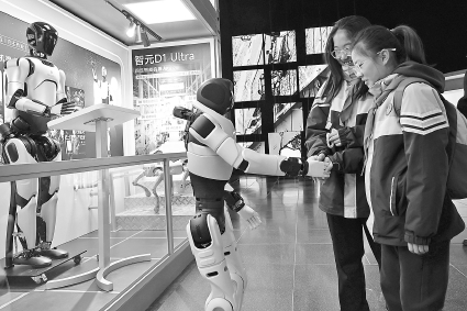 27日,参观者在上海科技馆“明日行者”展区内与机器人握手互动。当日,经过两年多系统化升级改造的上海科技馆开启首次运行压力测试,部分专业观众和媒体代表受邀入馆。