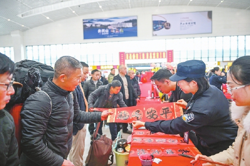“还是手写的春联最有年味!”在售票大厅,领到春联的返乡旅客赞叹。一旁的糖画手作体验区同样人气高涨,一名旅客有感而发:“原以为候车有些无聊,没想到还能领到特殊礼物,很有纪念意义。”