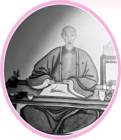 三余地然也将自己“留”在了族谱里。他的自画像,瘦削的老头一袭朴素的青袍,胸前挂着长珠串,正在怡然地画兰花。桌上是书和笔筒,右手前方搁着砚台,还有一小盅酒。为什么说是酒呢,因为左前方叠着四只小盅和一把绿瓷细嘴酒壶,仿佛随时有客人要来,一同相饮。这不,来客人了,他停下作画,笔还在指间,抬起头来,看着前方,神情有点惊讶,“咔”的这一瞬间,余地然画出的就是此刻自己这个样子。与其他画不同,自画像圈进了一个大大的圆里,暗含着是一面镜子。他在镜中取影,对着镜中摹画。