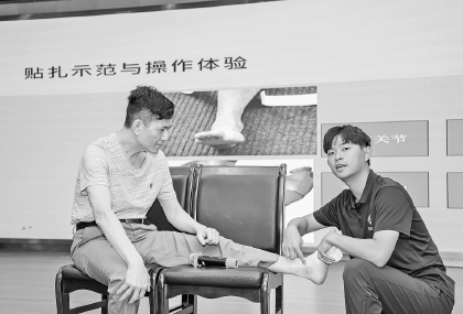 在活动现场,来自台湾的青年学生开展防护与康复现场实操,展现学以致用,强化实务与交流能力。参加活动的青少年运动员、鼓楼区居民朋友现场体验,促进青年专业服务在地健康事业。