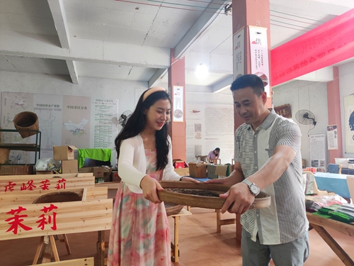 主播体验福州茉莉花茶窨制工艺。林若野 摄